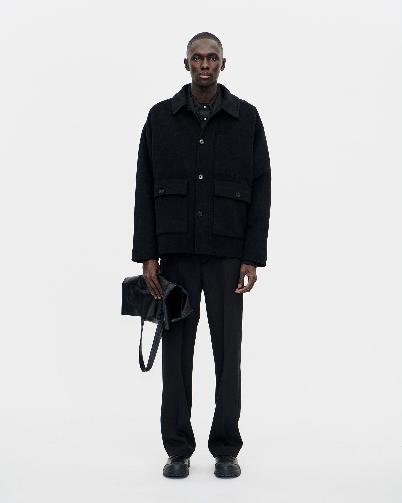 A double faced wool/cashmere blend jacket with a soft lush handfeel. Made in a relaxed fit with a slightly dropped shoulder and double pleated back. Features patch pockets on front and closes with real horn logo buttons. Unlined body construction with drop lining in sleeves.