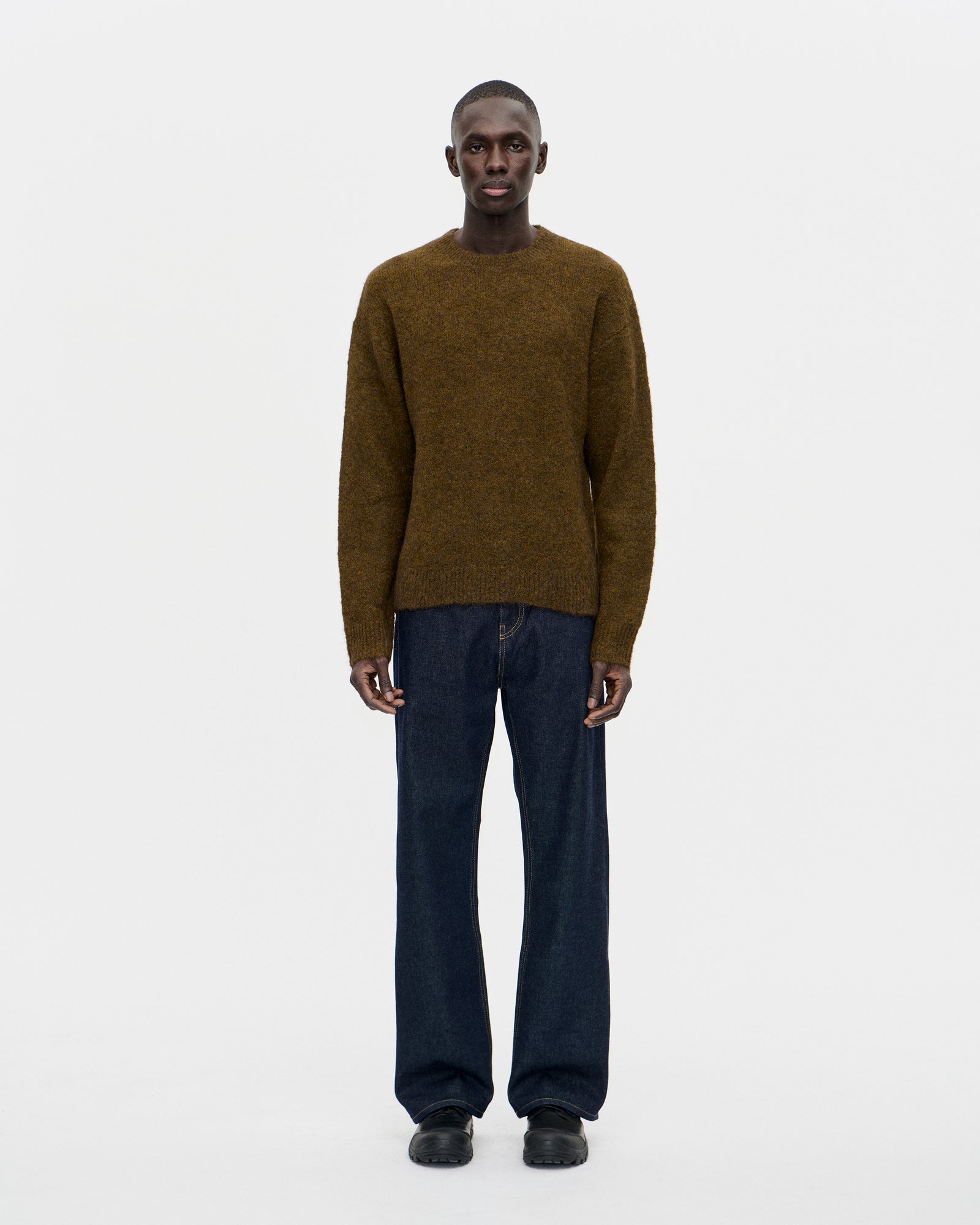 Our Alpaca Drop Crew is made in a lush alpaca/wool blend, with a soft hairy surface. Style is made with a slight drop shoulder, and features a ribbed hem, cuff and neck.