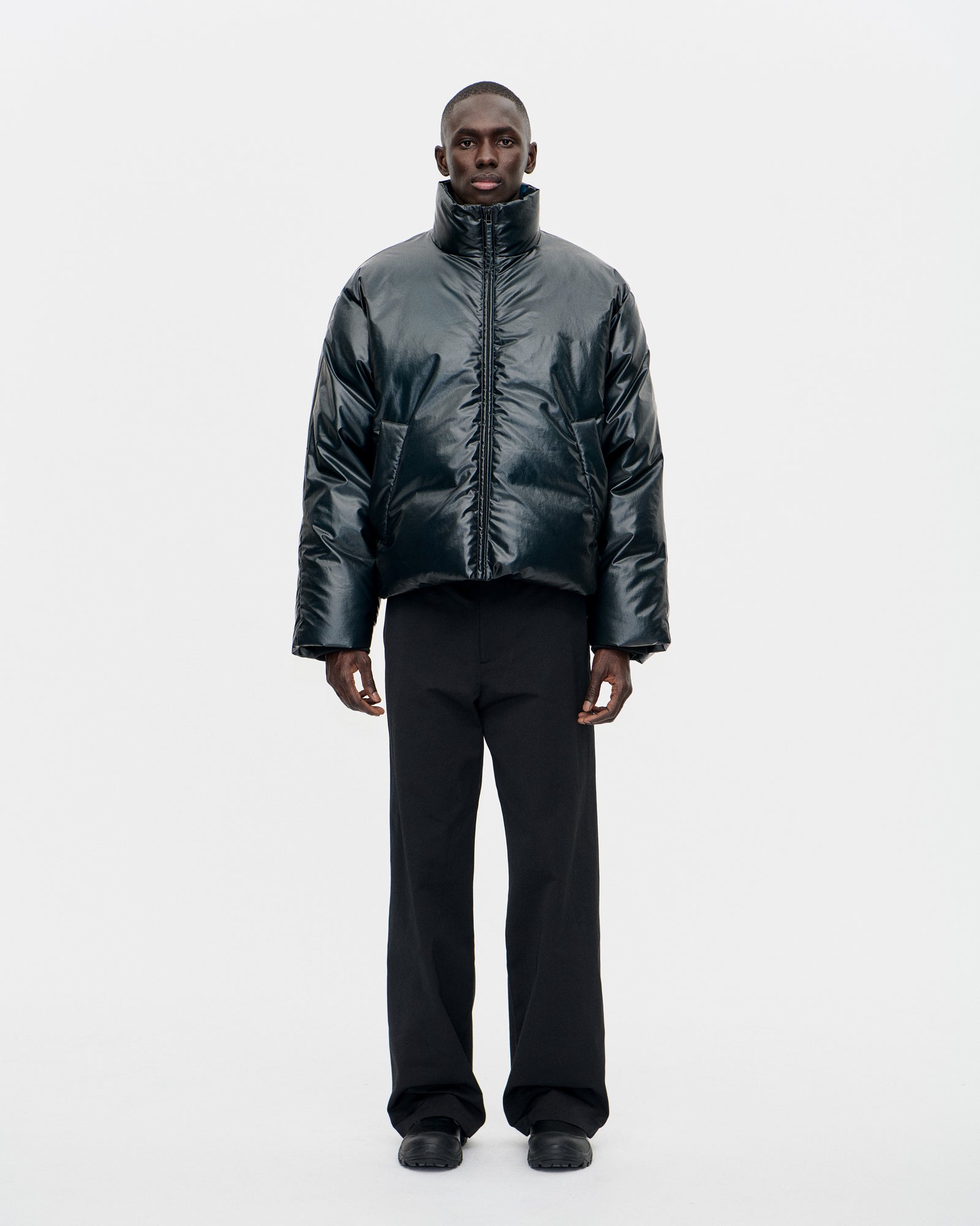 Our signature Altitude Puffer made a heat reactive polyester fabric. Fabric is changing color according to temperature, due to a reactive coating. Stuffed with real RDS down, 90/10 ratio. It's oversized with drop shoulders and a roomy articulated sleeve with darts on elbow. Features big welt pockets and a hidden zipper on front.
