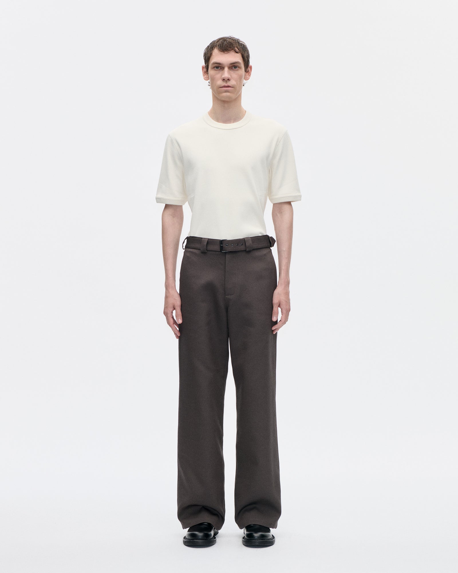 Produced in a technical deadstock wool fabric. The Belt Trouser has a straight wide leg and features zip fly, two side pockets, two patch back pockets, as well as a removable belt in waist.