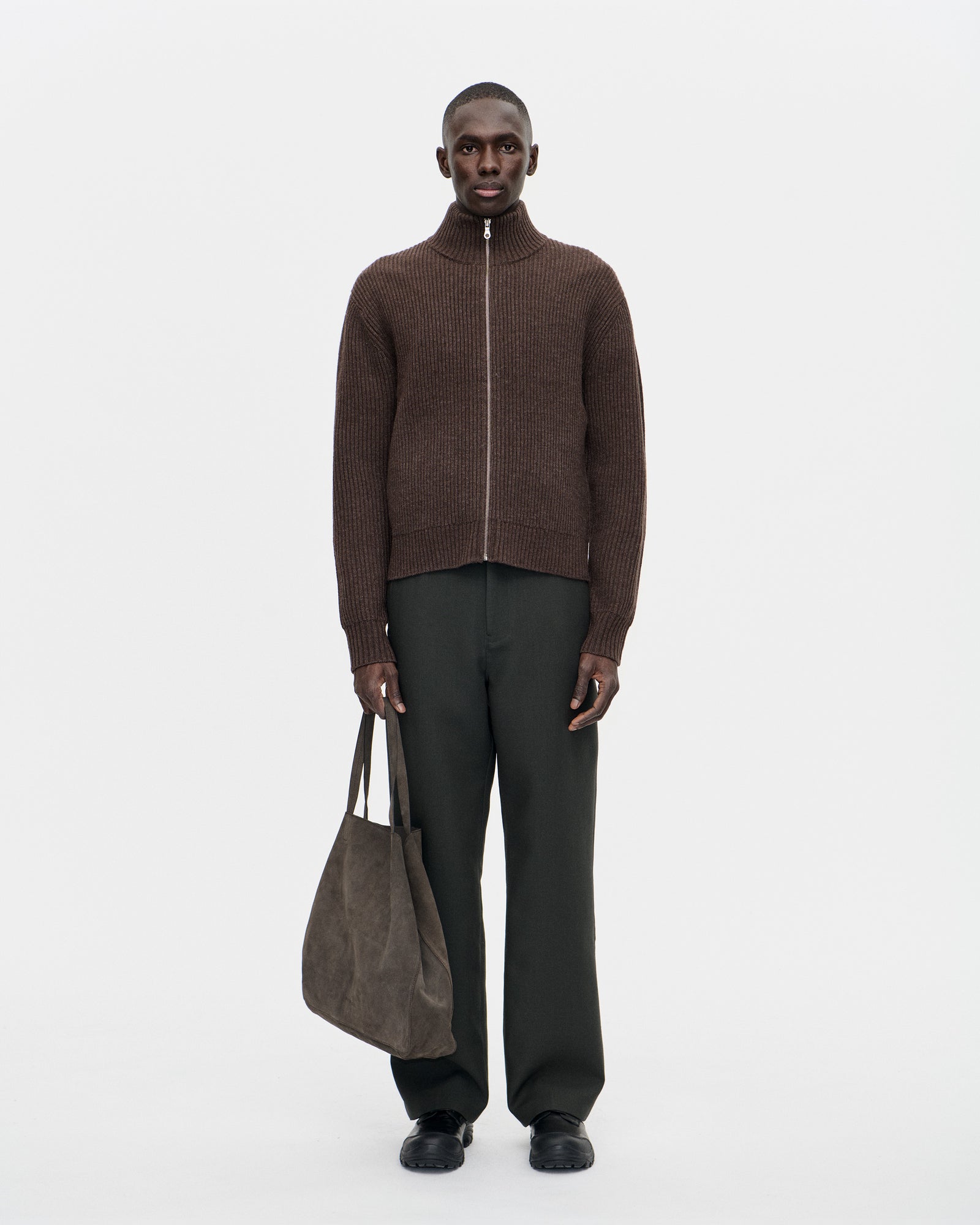 Our Drained Full Zip is made in a soft dry wool blend, featuring a metal front zip. Knit in a rib structure throughout.