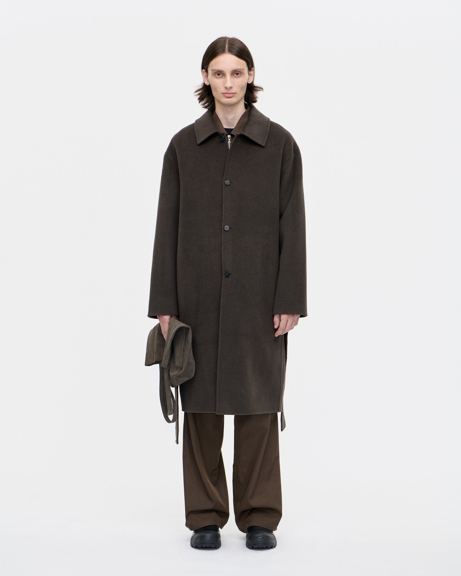 A double faced wool/cashmere blend coat with a soft lush handfeel. Made in a relaxed a shape fit with a slightly dropped shoulder and a removable belt in waist. Features hidden pockets in side seam on front and closes with real horn logo buttons. Unlined body construction with drop lining in sleeves.