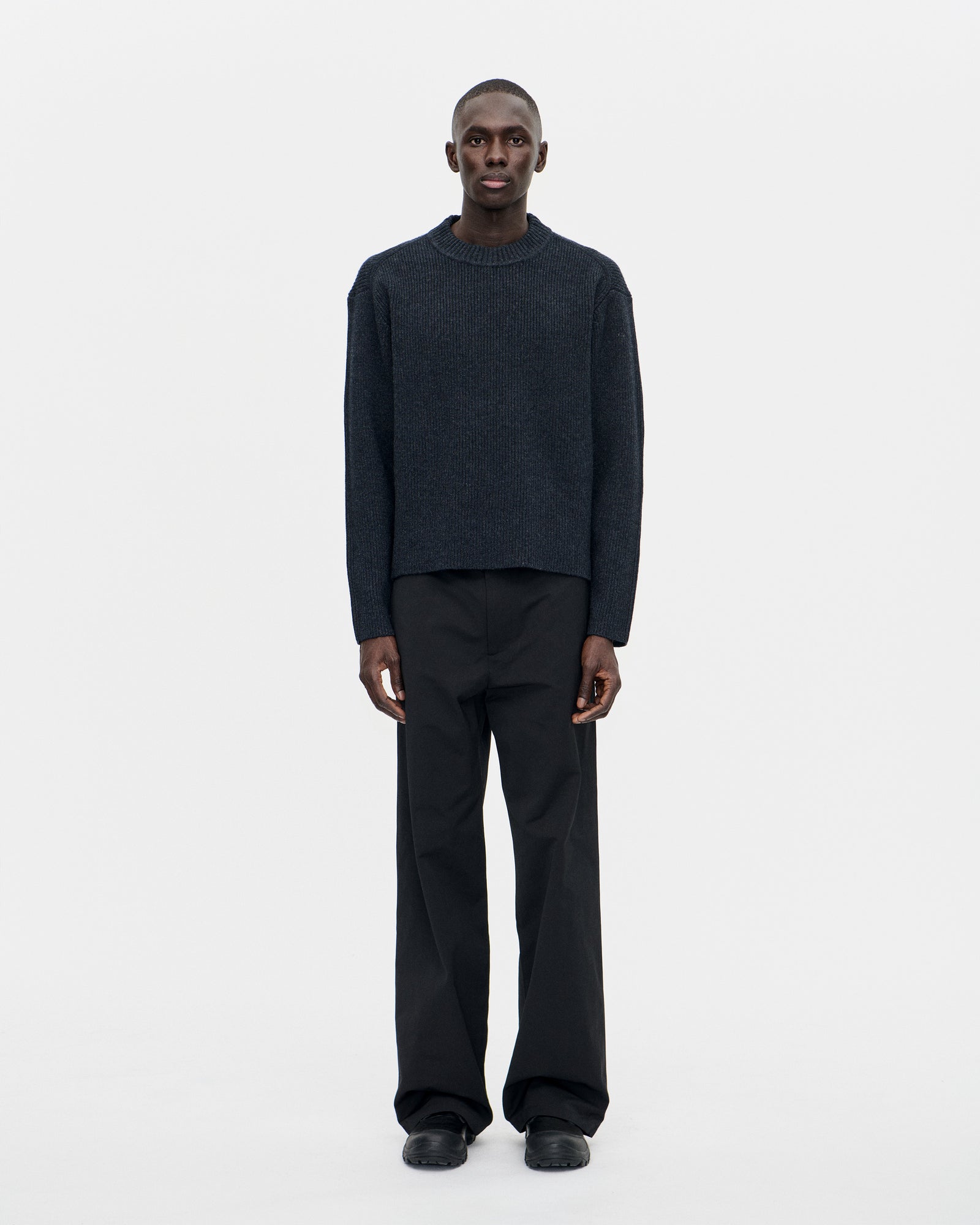 Our Naval Crew Lana is a made in a pure soft wool yarn, knit in a 4 ply 1x1 rib structure making it extra dense and chunky. It is made with a clean finishing on bottom and sleeve, and a rib neck. Regular fit.